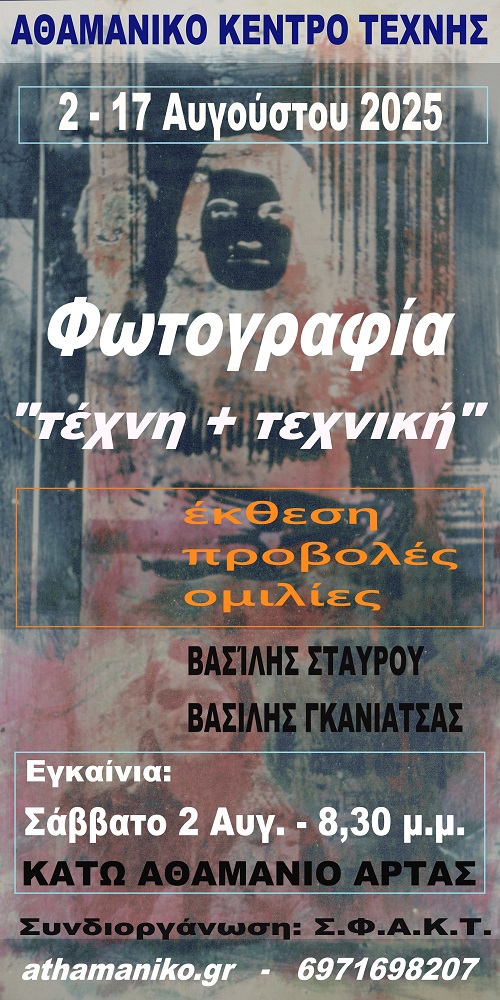 Εκδήλωση με θέμα “Φωτογραφία – τέχνη + τεχνική” που περιλαμβάνει έκθεση, ομιλίες και προβολές, σχετικά με τη τέχνη και τις τεχνικές της φωτογραφίας, διοργάνωσε το Αθαμανικό Κέντρο Τέχνης με την υποστήριξη του Συλλόγου Φίλων του Α.Κ.Τ. Τα εγκαίνια έγιναν στις 2 Αυγούστου, η δε έκθεση θα είναι ανοιχτή για το κοινό μέχρι τις 17 του μήνα. Ο εικαστικός Βασίλη Σταύρου εκθέτει έργα του με την τεχνική της φωτοϋδρογραφίας, καθώς και υλικό παραδοσιακής φωτογραφίας. Στα εγκαίνια ο φωτογράφος και κινηματογραφιστής Βασίλης Γκανιάτσας μίλησε για την ιστορία και την εμπειρία της τεχνικής στη φωτογραφία και την κινούμενη εικόνα. Οι ομιλίες και οι προβολές θα επαναληφθούν το Σάββατο 9 Αυγούστου, την ίδια ώρα, για όσους δεν θα είχαν τη δυνατότητα να παρευρεθούν στα εγκαίνια. Θα γίνει παράλληλα ενημέρωση του κοινού για το βασικό θέμα της ανέγερσης της πινακοθήκης και παρουσίαση της πρότασης του Α.Κ.Τ. για την ανάπλαση όλου του οικισμού Αγορασιάς του Κάτω Αθαμανίου.
